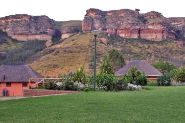 Camelroc Guest Farm provides a range of self catering accommodation options close to the Calendonspoort / Lesotho border post near Fouriesburg, Eastern Free State. Facing the spectacular sandstone hill with the outcrop shaped as a camel Caledon rivers. Camelroc can definitely be recommended as a good base from which to explore the Eastern Free State as well as Lesotho. For those who prefer to stay at base and relax, one can opt to take walks into the mountain, have a swim in the pool and braai beside the cottage whilst enjoying the serenity and splendour of this Eastern Free State countryside. There are diverse activities to be enjoyed and places to be discovered in the area. Accommodation at Camelroc consists of seven luxuriously appointed chalets sleeping from 3 to 8 persons. (the hikers cabin has been converted to a 2 bedroom chalet). In the main homestead one can be accommodated in their guest house, three rooms sleeping 6 are all en-suite and tastefully decorated with Oregon pine furnishings. Guests are welcome to enjoy the use of the thatched entertainment area around the pool or play table tennis on the patio. There is a netball ring in the garden and ample space to play ball games & volleyball. The Guesthouse, built from traditional sandstone, has a fireplace in the lounge. All the other rooms have heaters for the colder winter nights. Come and enjoy this country stay with its beautiful views of the countryside, bird life, small game, rock art and the poplars turning in autumn.